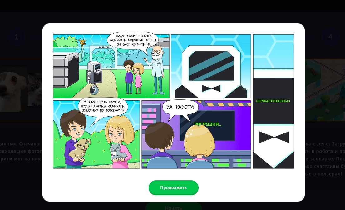 Прохождения Урок цифры 2019 начинается с небольшого комикса. Из него мы узнаем, что нам нужно научить робота различать животных. Выглядит он следующим образом.