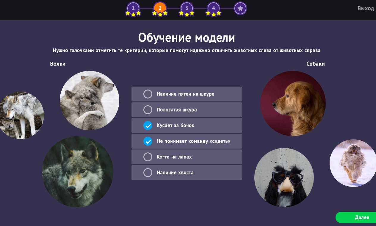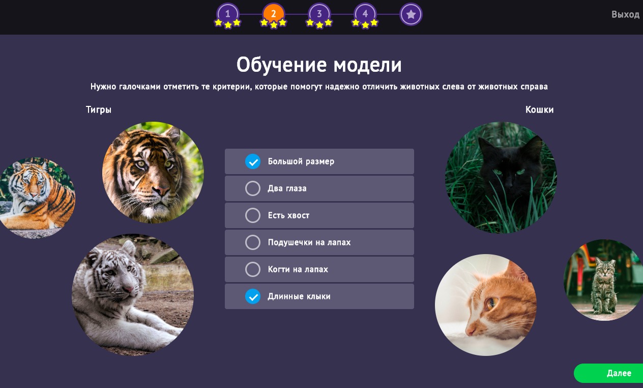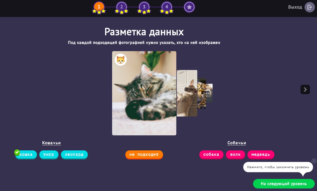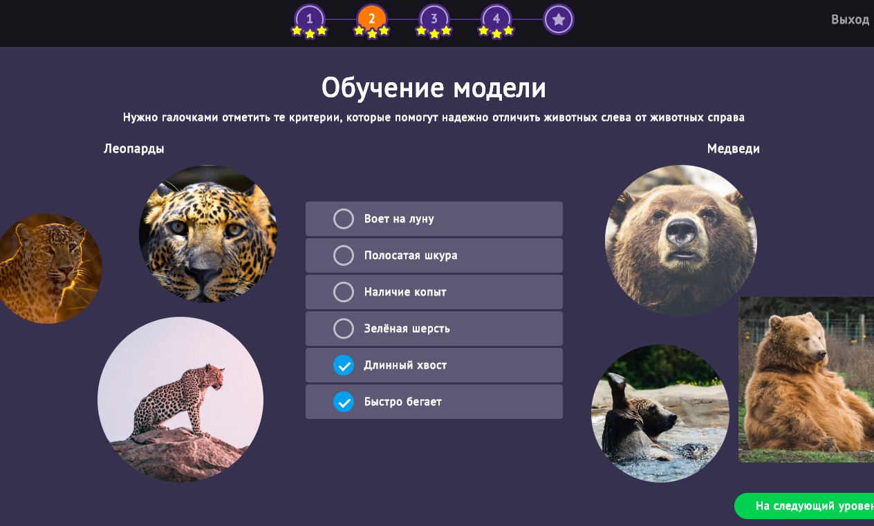 Первый уровень проходится достаточно просто: нужно правильно называть изображение на картинке. «Называете» с помощью выбора: собака, волк, медведь, кот, тигр, леопард. Если кого-то из животных нет на картинке – нажимаете «не подходит. Прохождение этого уровня займет у вас не больше пяти минут. После этого ваш искусственный интеллект научится распознавать животных и вы сможете перейти на следующий уровень.