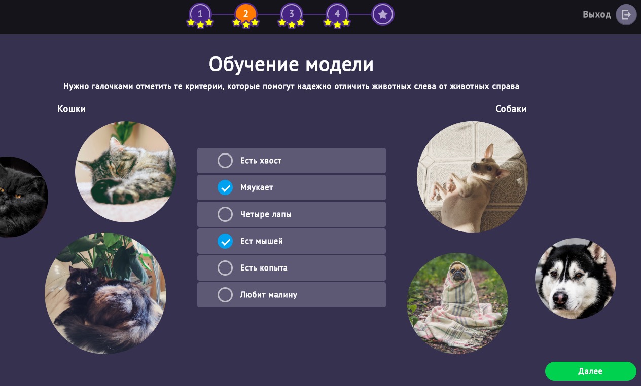 На втором этапе игры Урок цифры 2019 вам необходимо обучить алгоритм отличать животных друг от друга. Экран условно разделяется на три части: с одной стороны – один вид животных, например, коты, с другой – другой вид, например, собаки. Посредине характеристики, которыми могут обладать эти животные. Вам необходимо выбрать ту характеристику, которая точно отделяет один вид от другого. На данном этапе легче показать, чем рассказывать. Вот правильные ответы.