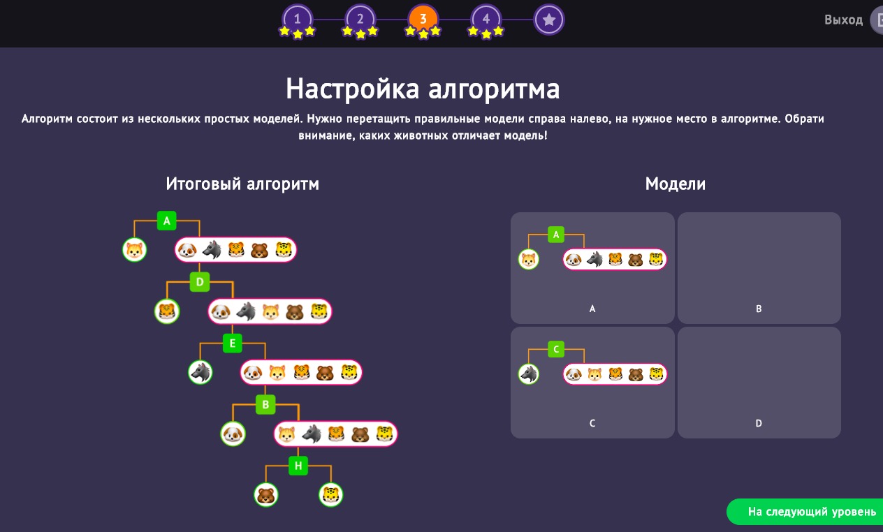 Третий этап – настройка финального алгоритма. Робот уже может отличить кошку от собаки, но его алгоритм нужно сделать универсальным. Ваша задача – перетащить правильные модели справа налево, на нужное место в алгоритме. Вот так выглядит правильный и рабочий итоговый алгоритм!