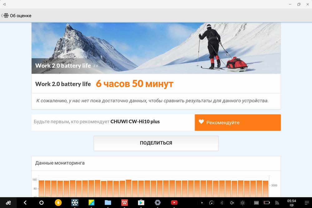 Если говорить об автономности, то Chuwi Hi10 Plus демонстрирует порядка семи часов активности экрана. То есть при обычном использовании девайса его хватит на два-три дня использования. Учитывая функцию гибернации в каждой ОС, можно без проблем оставить планшет на неделю, а затем обнаружить потерю лишь нескольких процентов заряда.