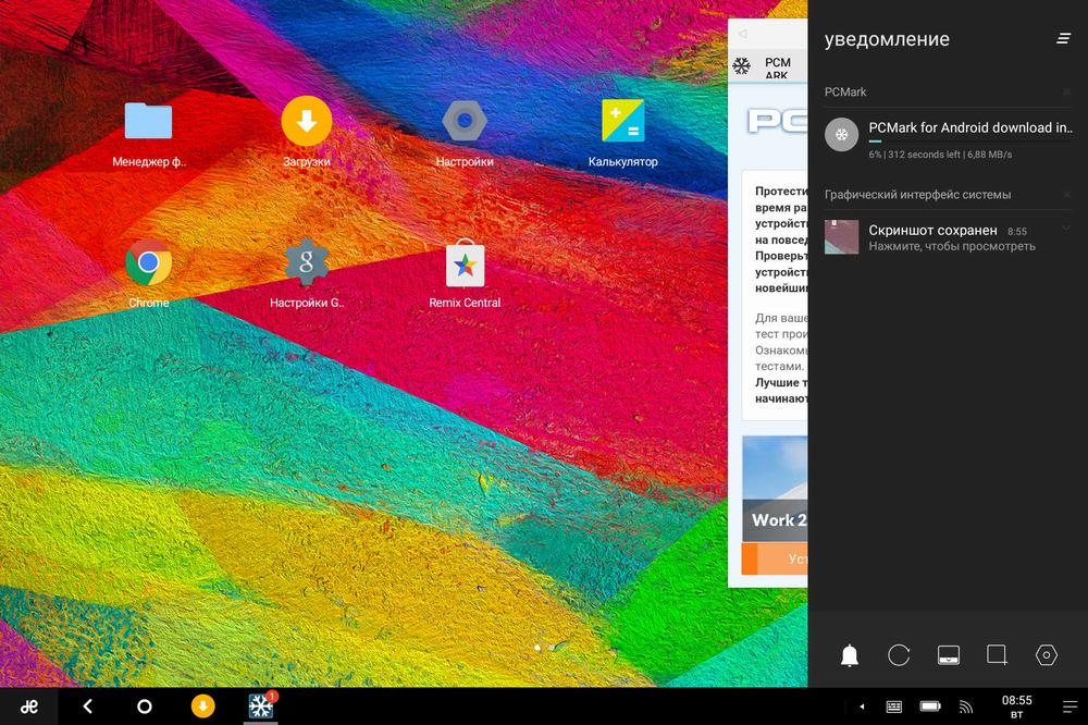 Девайс от Chuwi имеет в качестве предустановленных систем две наиболее популярные ОС от Microsoft и Google. При первом взгляде на Remix OS заметно необычное для Android расположение статусной строки в нижней части дисплея, с ярлыками запущенных программ на манер настольных ОС, а также вкладками быстрых настроек в правом углу. Кнопка Пуск в левом нижнем углу содержит в себе все установленные приложения, а сочетание Alt+Tab позволяет перемещаться между окнами на манере Windows. Однако главной особенностью Remix OS является то, что каждое приложение работает в отдельном окне как в той же Windows. Есть и кнопка Свернуть, Развернуть и Закрыть. Многозадачность полноценная, а предустановленные утилиты уже включают пакет приложений от Гугл. В общем, Remix OS - это Android, выполненный в манере Windows со всеми ее удобствами, поэтому при переходе с одной ОС на другую проблем с адаптацией не возникает вовсе.