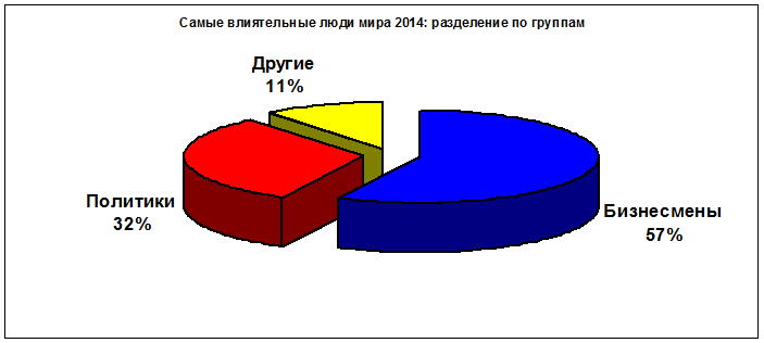 - Наиболее влиятельными являются главы государств (15 участников, из них 5 занимают первые пять мест рейтинга) и владельцы крупных холдингов (тоже 15 человек, финансовые, промышленные и телекоммуникационные холдинги, диверсифицирующие активы по нескольким направлениям)